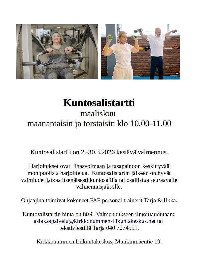 Jos tulet ensimmäistä kertaa tai pitkästä aikaa vuosiin kuntosalille, kysy meiltä rohkeasti neuvoa. Tarjoamme mm. alkuohjausta ja Personal Trainerin palveluita. Avullamme saat kaiken ilon ja hyödyn irti kuntosalipalveluista ja ryhmäliikunnasta.